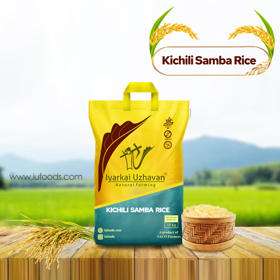 தமிழ்நாட்டைச் சேர்ந்த பழங்கால அரிசி, கிச்சடி சம்பா அரிசி (கிச்சடி சம்பா அல்லது கிச்சிலி சம்பா அரிசி என்றும் அழைக்கப்படுகிறது) நெல்லின் பிரபலமான பாரம்பரிய அரிசி வகைகளில் ஒன்றாகும். இது சாதம், பிரியாணி மற்றும் கஞ்சிக்கு சிறந்த தானியமான வெள்ளை அரிசி. இந்த அரிசியை தொடர்ந்து சாப்பிடுவது உடலில் நோய் எதிர்ப்பு சக்தியை அதிகரிக்கிறது மற்றும் நமது வலிமையை கணிசமாக மேம்படுத்துகிறது என்பது தனிப்பட்ட அனுபவம். மெல்லிய தண்டுடன் நன்றாக தானியமாக இருந்தாலும், இந்த நெல் வகை மிகவும் கடினமானது, பூச்சிகள் மற்றும் நோய்கள் இரண்டையும் எதிர்க்கும் மற்றும் வறட்சி மற்றும் வெள்ளம் இரண்டையும் தாங்கக்கூடியது.